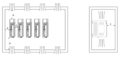并排安裝時(shí),橫向兩側(cè)建議各留 30mm 以上間距V1規(guī)格,無(wú)風(fēng)扇結(jié)構(gòu),采用側(cè)面散熱片進(jìn)行散熱,因此必須留有30mm的間隙)。首尾兩臺(tái)驅(qū)動(dòng)器與柜體側(cè)面之間,至少留有 50mm 間隙。
